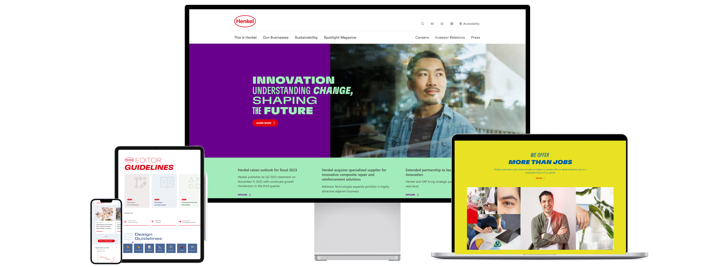 How can we create a global digital flagship that brings together Henkel’s business units, investor relations, sustainability goals, and employer branding in one flexible and modern platform? Halfway through the project, Henkel launched a major rebranding, which meant rethinking and refining our designs to align with the new visual identity.