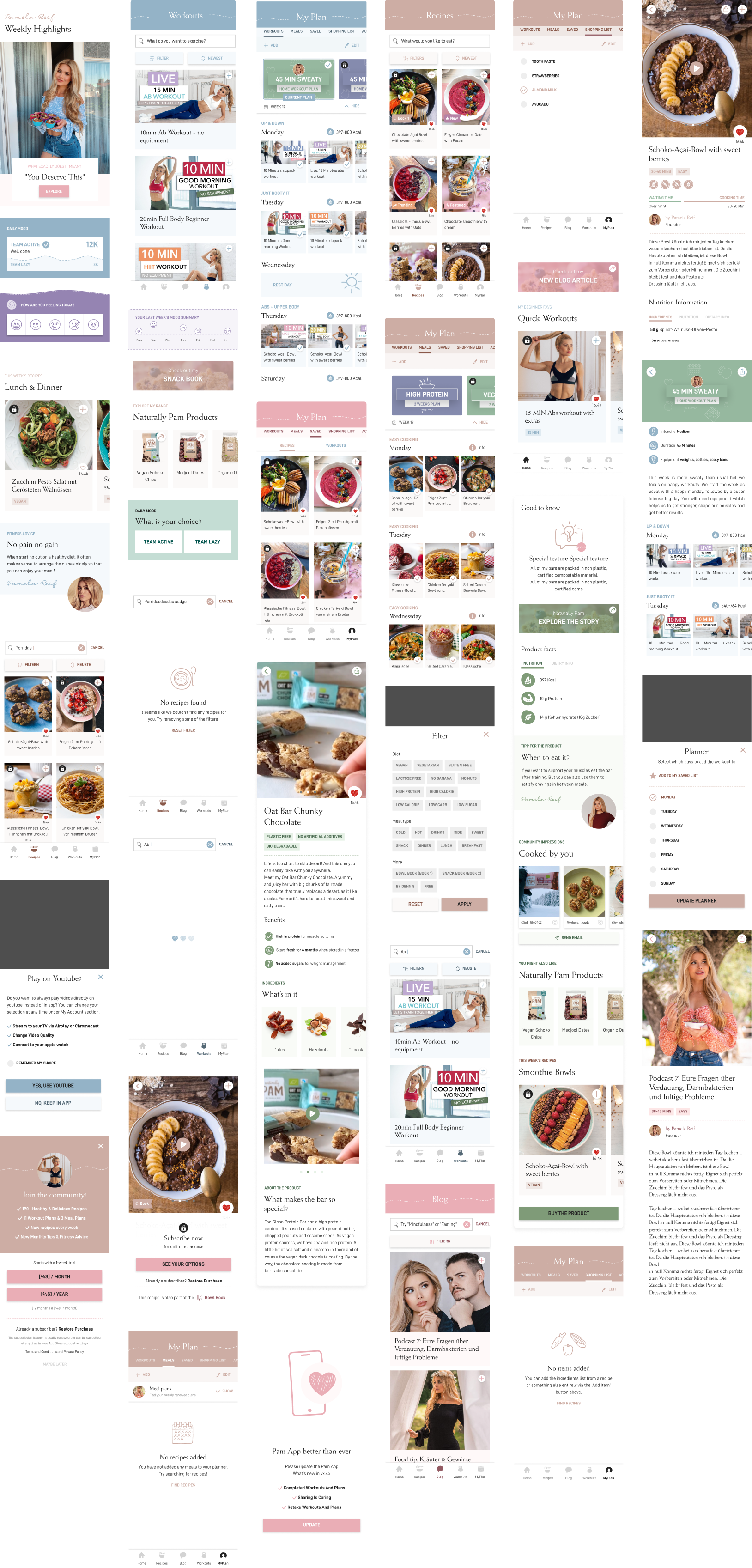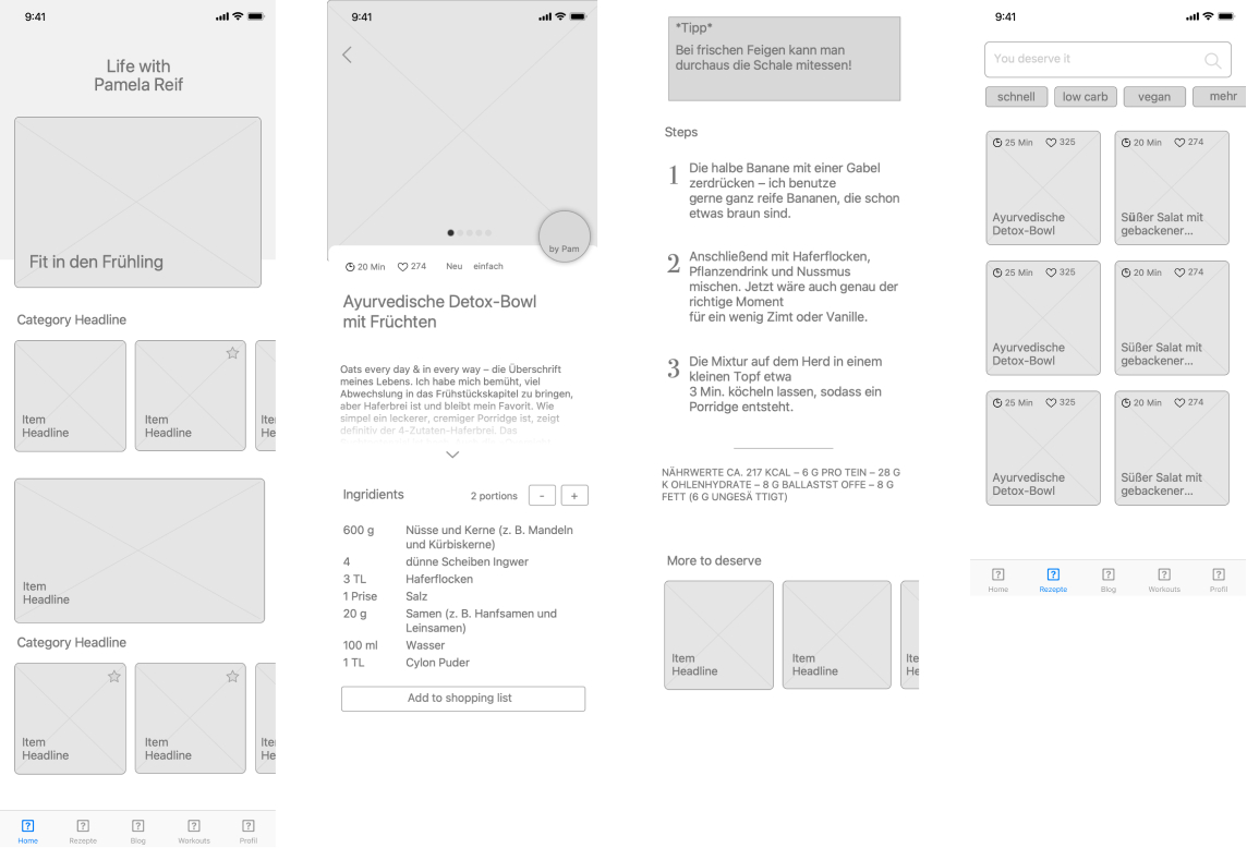 The initial workshops was a sit in with Pamela and her team to understand her vision and goals for the future, and to develop an MVP that can be attractive to her followers to use on a daily basis. So was the concept phase started: within multiple workshops and iterations we were able to capture the heart of the app through wireframes.